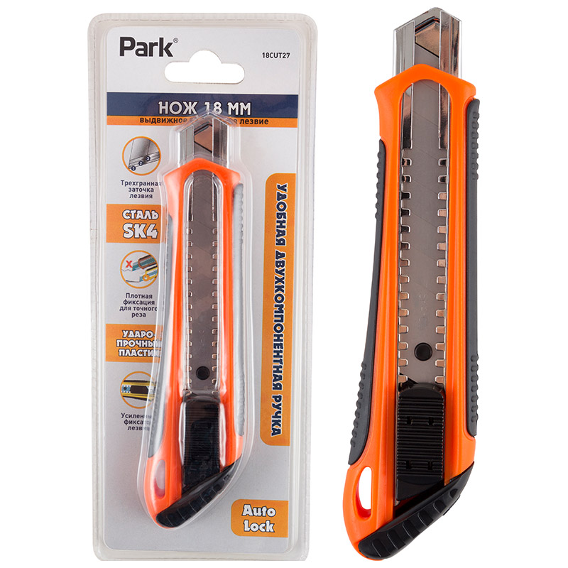 Нож технический Park 18CUT27 лезвие 18мм, метал.напр., 2-х комп.ручка,, сталь SK5 355027